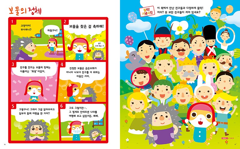 <이야기나라 대모험 2 안데르센 동화편>에는 안데르센의 대표작 <인어공주>, <엄지공주>, <외다리 병정>, <성냥팔이 소녀>, <다섯 개의 완두콩>, <백조왕자>, <미운 아기 오리>, <벌거벗은 임금님>이 등장합니다. 뾰족한 가시 때문에 친구를 사귀지 못하는 가엾은 고슴도치에게, 상냥한 친구 고양이는 동화의 나라 안데르센에 가서 친구를 사귈 수 있게 도와주는 보물을 찾자고 제안하지요. 그리고 둘은 안데르센 나라의 8가지 동화 속에서 모험을 펼치고 비밀에 싸여 있던 보물(?)을 찾아내게 됩니다. 과연 이 귀중한 보물은 무엇이었을까요? <미로 대탈출 이야기나라 대모험 2 안데르센 동화편>에서 직접 발견해 보세요.