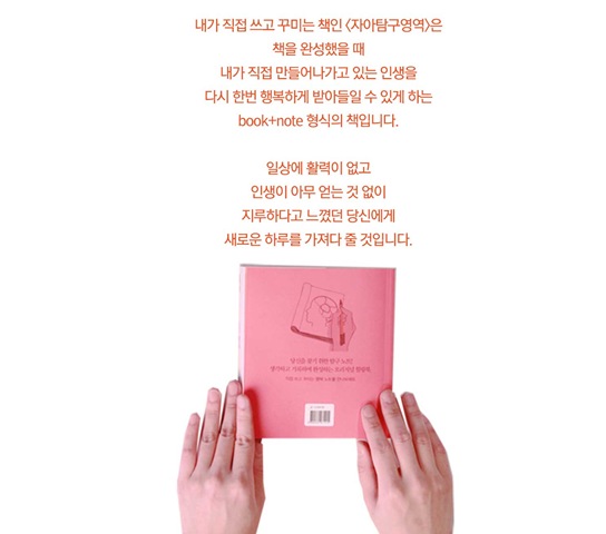 내가 직접 쓰고 꾸미는 책인 <자아탐구영역>은 책을 완성했을 때 내가 직접 만들어나가고 있는 인생을 다시 한 번 행복하게 받아들일 수 있게 하는 ‘book+note’ 형식의 책입니다.
