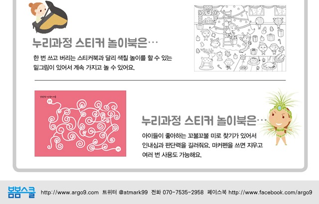 한 번 쓰고 버리는 스티커북과 달리 색칠 놀이를 할 수 있는 밑그림이 있어서 계속 가지고 놀 수 있어요.
