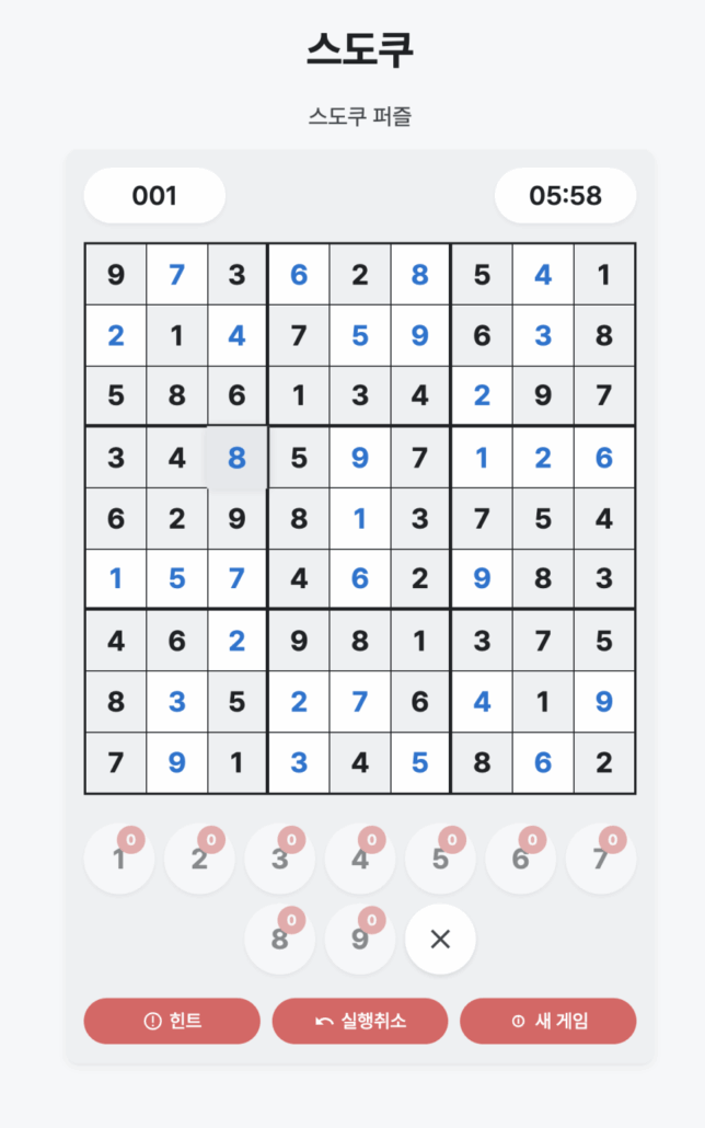 - **스도쿠 로직**: JavaScript로 스도쿠 생성 및 검증 알고리즘 작성(예: 백트래킹 알고리즘 활용).