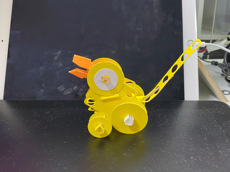 스톱모션을 만들 수 있게 입을 움직일 수 있게 만들었고 바퀴로 발을 만들어 이동도 가능합니다. 몸체와 연결하는 손잡이로 끌거나 밀어서 움직여 볼 수 있습니다.
