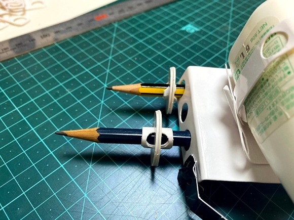 연필을 고정하는 방법은 2개 짜리 브릿지 부분을 연필에 말아 O형 구멍을 고정하는데 사용하면 됩니다.