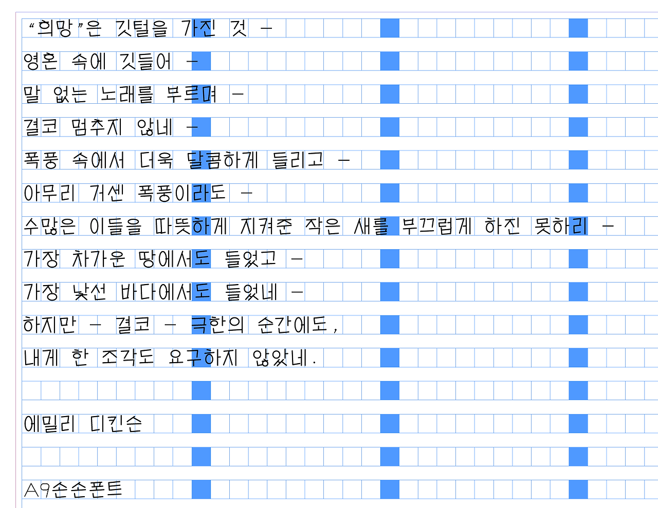 일단 가로 세로를 한 번에 작업하기 때문에 일정하게 균형을 유지할 수 있습니다. 특히 세로줄의 ㅏㅣㅖㅒㅞㅟㅘㅙ 등의 모양을 기준으로 잡고 작업을 하며 ㅗㅡㅜㅠㅛ 와 같은 가로줄의 가이드를 맞출 수 있습니다. 작업에 대한 방법론은 영상으로 남기겠지만 일단 방법론에 대해서 이야기드립니다.