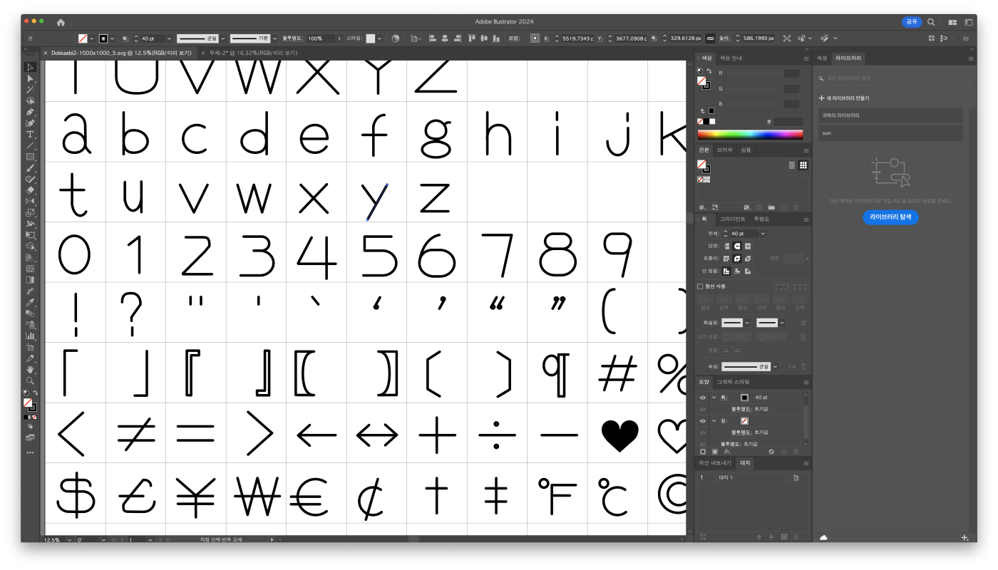한글과 조화를 이뤄야 하는데 아직 작업을 다 못해서 영문은 커닝 조정이 필요해서 지금 폰트 프로그램을 살펴보고 있습니다. 스트로크 기반의 폰트를 만들겠다고 해서 가독성 높은 글자를 만들어볼까 하다가 일단 기능성 위주의 따라쓰기 폰트 그리고 SVG로 출력되는 에디터로 플로터에 활용할 수 있는 에디터 작업이 되면 제법 쓸만해 지지 않을까 합니다.