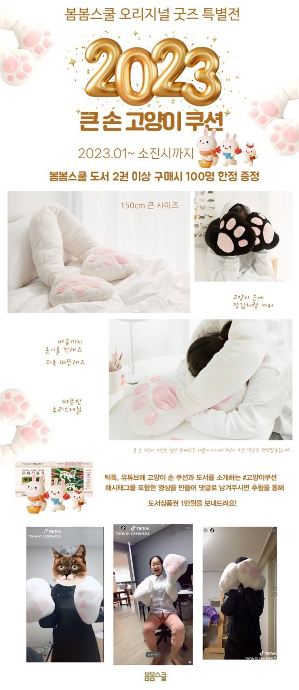 이번에 이벤트로 틱톡, 유튜브에 고양이 손 쿠션과 도서를 소개하는 영상을 만들어 올리면 상품권을 증정하기~ 고양이 손은 후리스재질인데 다음번에는 다른 재질로 만들 생각으로 준비중입니다. 재미있게 영상찍어 올려주시는 분들이 생기면 홍보효과로 보고 추가 행사도 진행해볼 생각입니다.