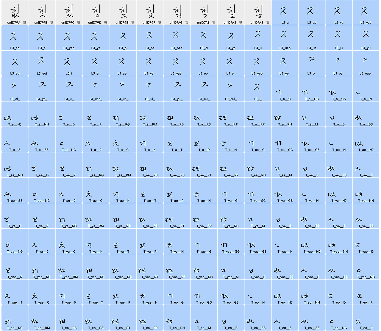 사실 폰트를 만들 때 컴포넌트를 만들어서 글씨가 어떤 모양에 따라 다 다른 초성을 만들어 넣게됩니다. 예를 들어 ㅔㅣ 같은 경우 초성의 모양이 달라지죠... 저희가 만든 폰트 생성기는 바로 폰트편집기에서 부분 수정이 모두 가능하도록 작업을 해놨습니다.