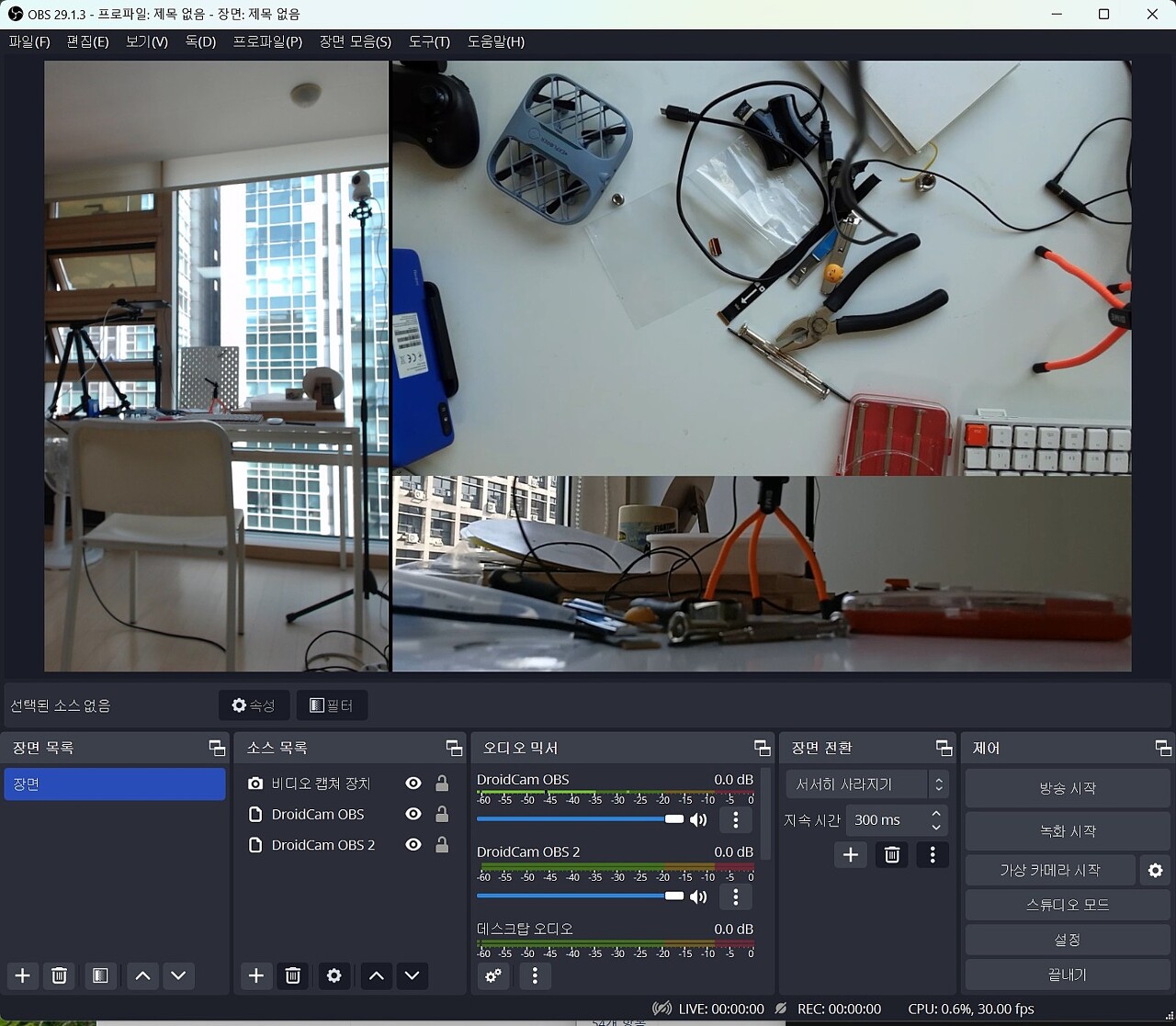 스마트기기는 Droidcam 플러그인을 설치해서 OBS에서 플러그인으로 연동할 수 있게 했습니다. 이 프로그램은 유료가 아니라서 사용에 부담없습니다. 다만 드로이드캠의 사운드는 별로네요. 다시 유선으로 녹음하도록 하겠습니다. ^^