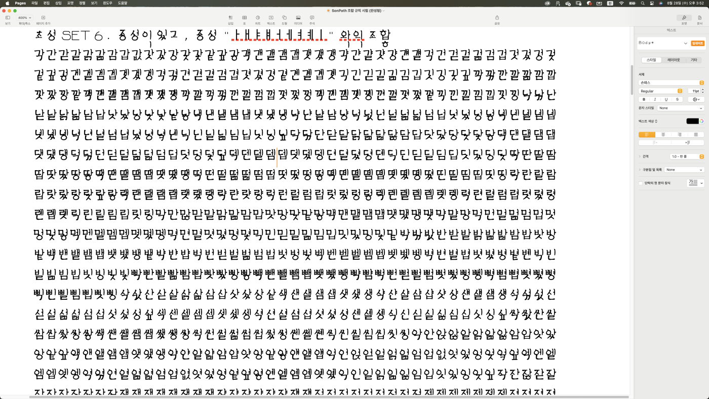 사실 디자인할 때 폰트에서 한글 자모를 떼어다가 레터링 하듯 폰트 자체를 다시 재구성하는 것도 가능합니다. 그리고 그룹지어 움직이거나 한글을 24자의 좌표조합으로 380여개로 늘려서 다시 완성형으로 제작하는 것도 가능하며 이 구성을 통해 기존 폰트를 새로운 폰트로 만드는 것과 좌표에 의한 메타정보를 가지고 그때그때 다른 형태의 레터링이 가능하게 됩니다.