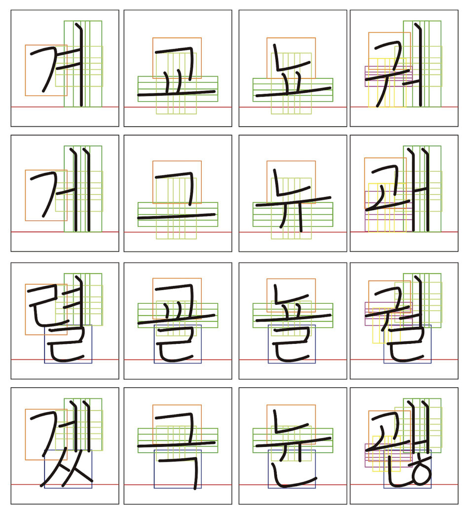 그러면 거꾸로 초성, 종성의 유형은 자유롭게 블록으로만 처리하고 중성의 위치에 따라 초성의 다양한 형태를 쓰거나 균형, 조형을 직접 체감해볼 수 있으리라 생각됩니다. 중성이 기준이 되는 이유는 글자의 안정감과 균형을 맞추는 중심이 되기 때문입니다.