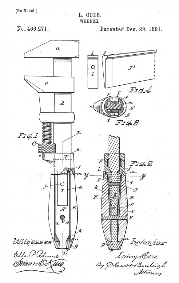 1841년 특허 출원을 한 코즈는 이미 영국의 조절용 렌치에 사용되던 ‘몽키 렌치’라는 명칭을 발명품에 붙여 광고와 판매를 진행했다.