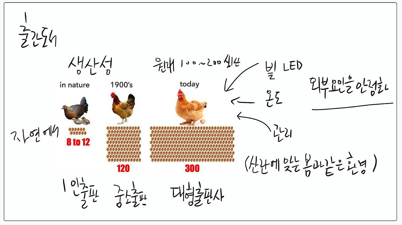 자연에서 닭은 봄에 산란이 가능할 때에만 알을 낳는 것으로 되어있고 8~12 마리 내외를 낳을 수 있다고 합니다. 그런데 1900년대에 닭을 양계장에서 산란을 시작하며 120마리 그리고 현대에는 봄과 같은 산란기 환경을 만들어줘서 300마리까지 낳을 수 있다고 합니다.