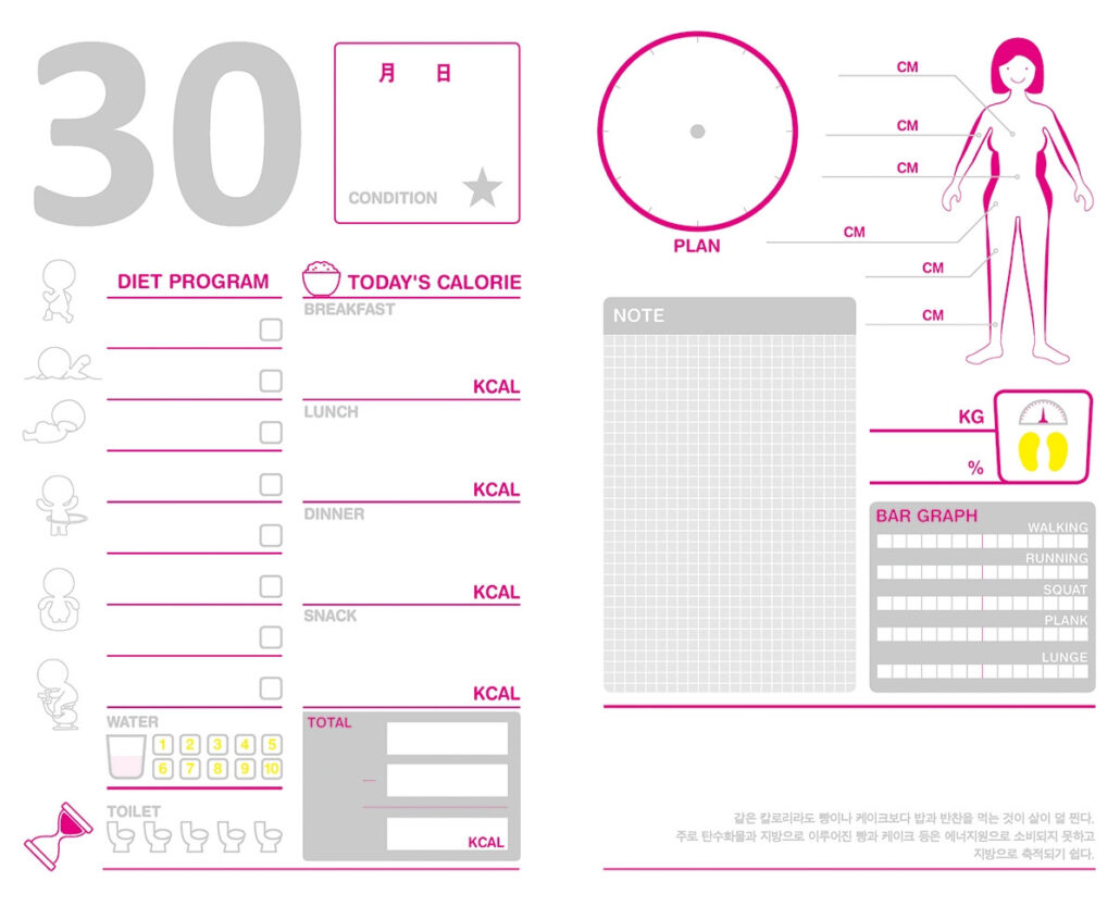 10년 전에 만든 다이어트99 노트 다이어트 하는 애니메이션을 다 기획하고 만든 99-0 일까지 기록을 측정하는 다이어리였어요 ^^