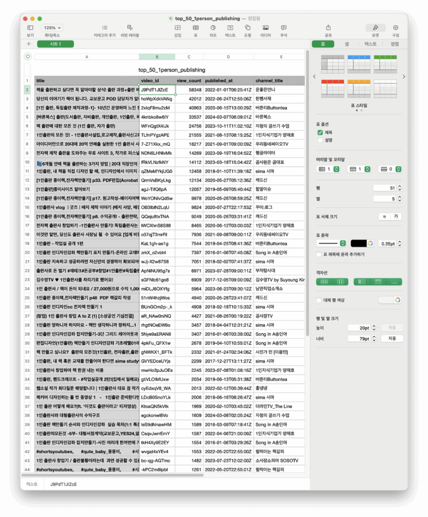 그동안 유튜브에도 관심 없었고 그냥 영상은 닥치는 대로 만들다가 이제 유튜브가 출판이다라고 생각해서 Youtube API로 남들이 뭘 하고 있는지 키워드로 1인출판을 넣고 데이터 다 받아서 어떻게 해야 할지 보고 조회수를 보는데...