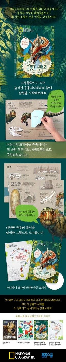 YES24에서 내셔널지오그래픽 숨겨진 백과사전 시리즈를 예약판매합니다. 특전으로 공룡모형을 제공합니다. 스마트한 플랩북으로 공룡과 곤충의 숨겨진 사생활을 알아보세요 최신 논문과 이론으로 몰랐던 내용을 업그레이드하실 기회입니다.