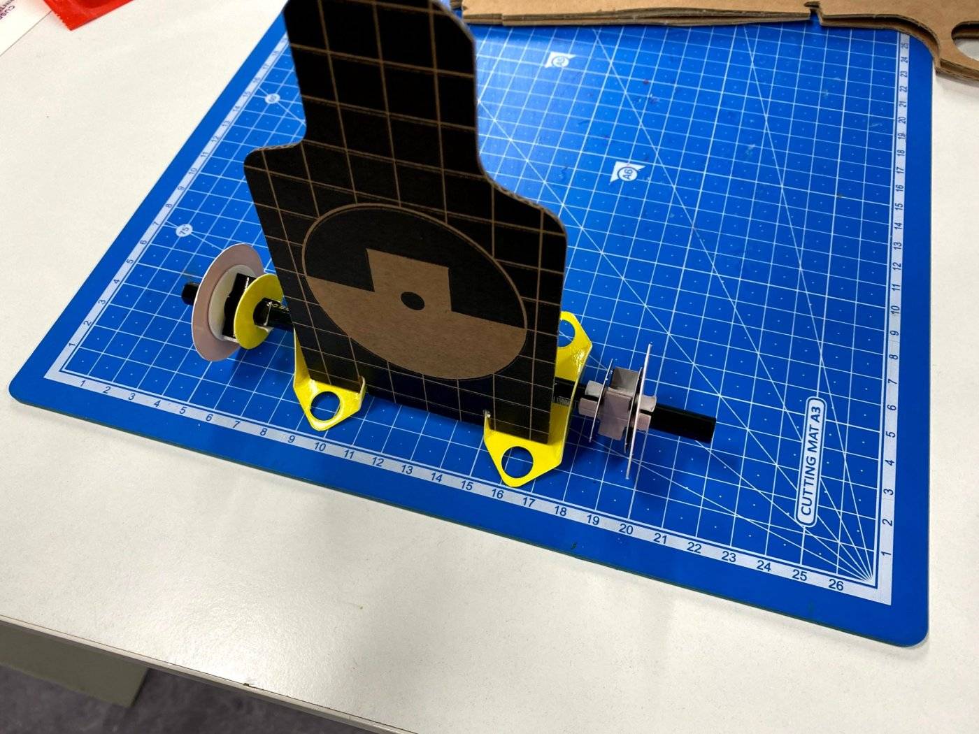 작년에 그냥 바퀴를 만들어 타겟에 총맞으면 바퀴가 움직인 거리를 재서 누가 이겼는지를 확인할 수 있게 바꿨습니다. 오늘 페이퍼브릭과 연필로 타겟에 바퀴를 달아서 측정해봤습니다.