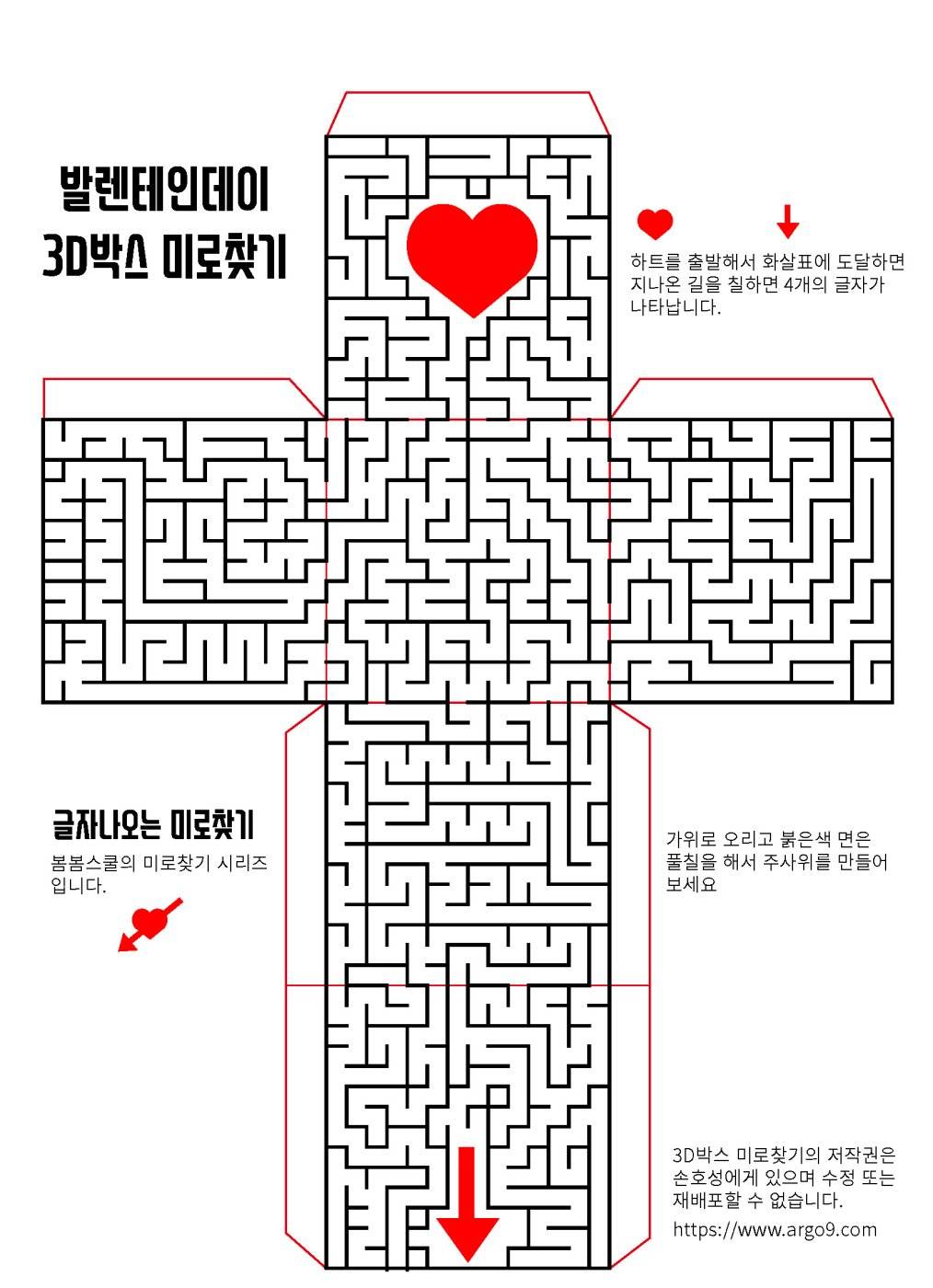 발렌타인데이 3D박스 미로찾기 하트로 출발해서 화살표까지 도달하면 지나온 길을 칠하면 글자가 나옵니다. 4글자가 나옵니다.
