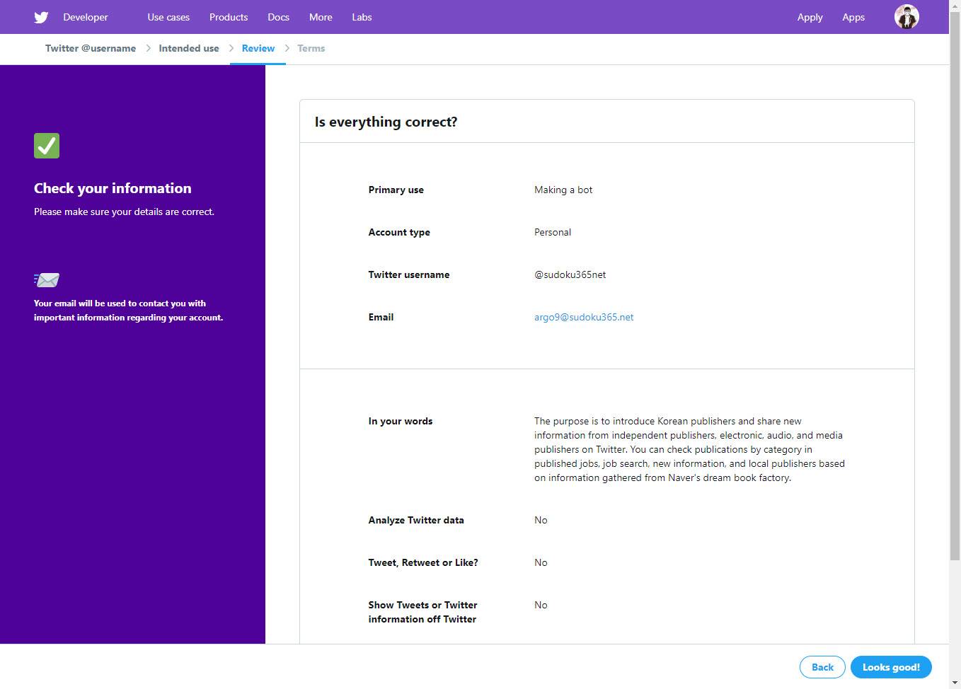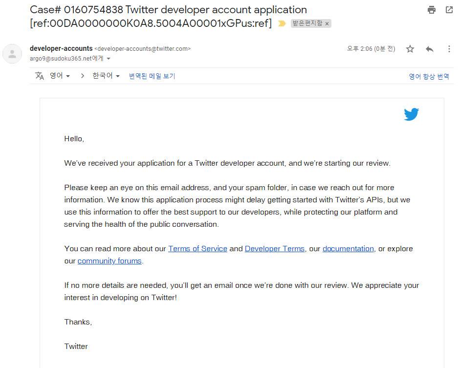 9. 트위터 개발자 등록에 부족한 사항이 생기면 메일로 수정하면 됩니다.