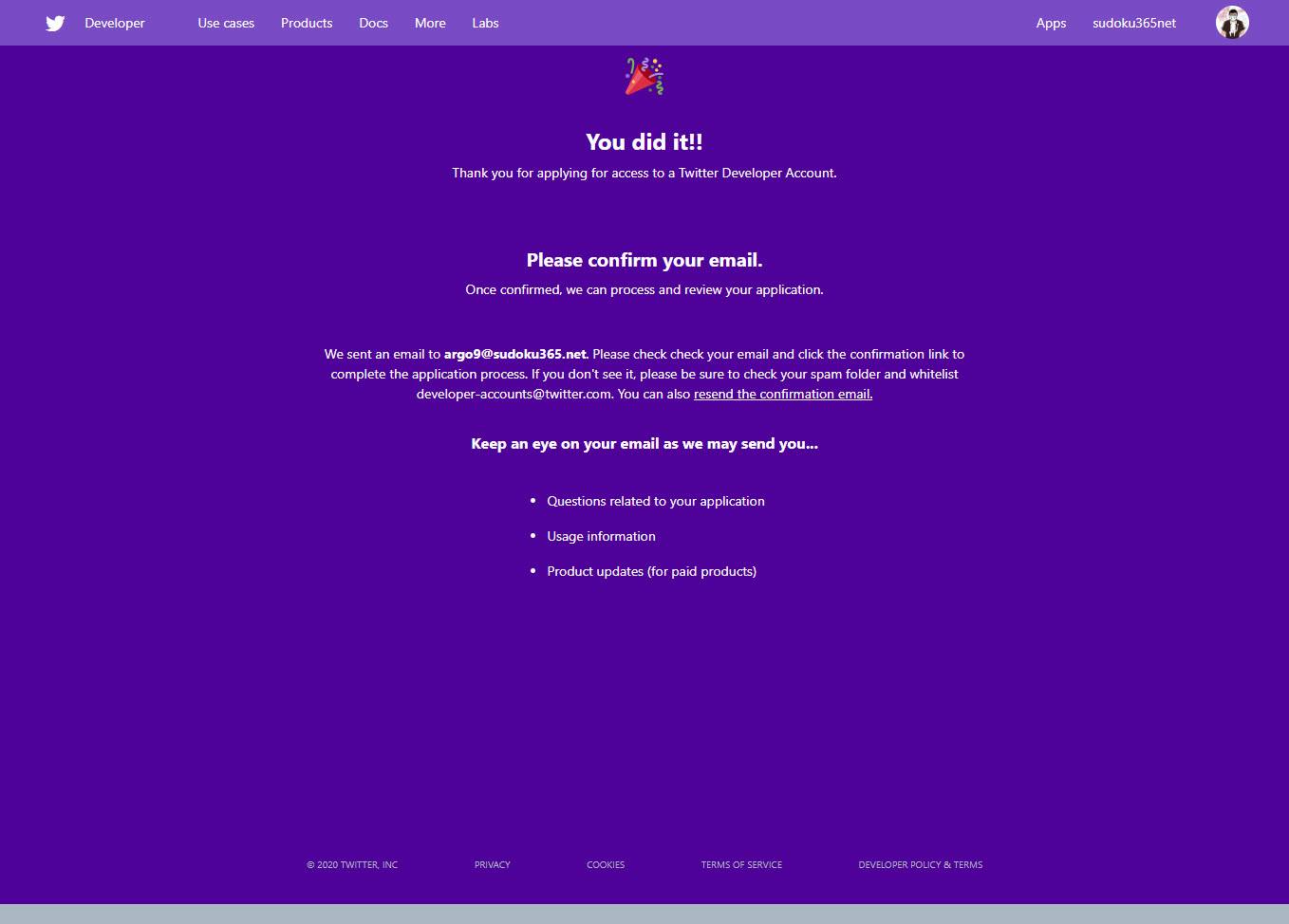 8. 어플리케이션 컨펌 대기를 하고 트위터에서 향후 메일로 알려줍니다.