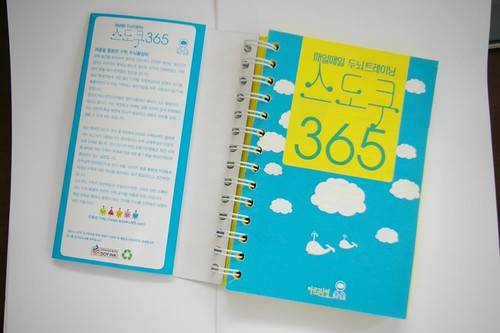링제본 스도쿠 (표지에서 구름처럼 보이지만 두뇌입니다, 고래는 온난화로 빙하가 녹으면 크릴이나 새우가 줄어 희생되는 포유류입니다.) 네이버 스도쿠매니아 회원들의 의견을 모아 가장 가지고 싶은 책의 형태를 6개월이상 설문조사하여 만들어진 자료를 바탕으로 독자들이 좋아하는 많은 양의 퍼즐, 이동시 편리한 링제본, 시각적 주의분산이 안되는 디자인과 색상 주로 종이에 손을 많이 대서 오랜기간 퍼즐을 풀기 때문에 독자를 위해 친환경인증 재생용지와 콩기름잉크, 제본시 들어가는 화학물질이 없는 링제본을 사용하여 환경 친화적이고 아토피 걱정없는 책입니다.