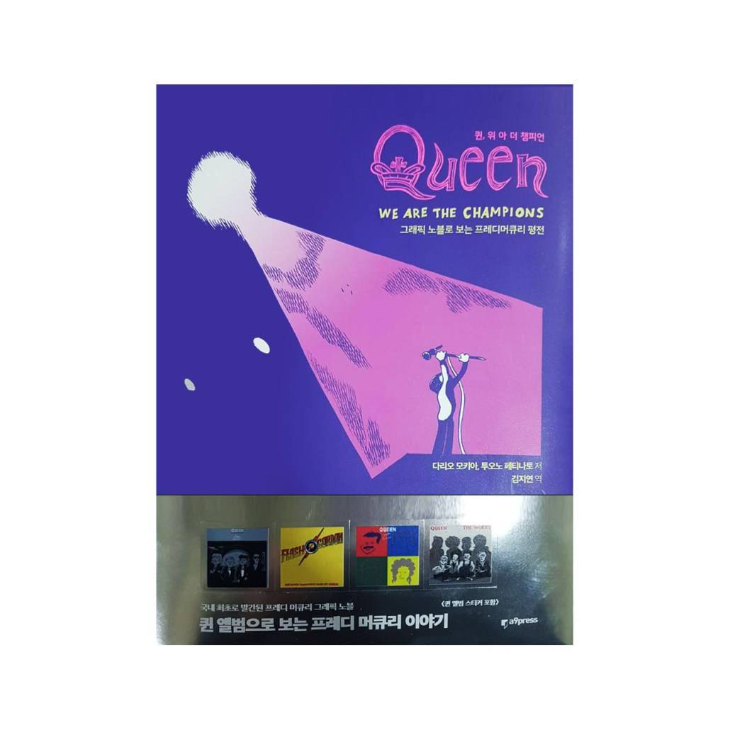 퀸: 위아더 챔피언 목업 띠지의 크기를 변경했으며 좌우 여백과 안쪽까지 칼선을 넣어 그래픽노블에 포함된 퀸 앨범 일러스트를 스티커로 제작했습니다. 은색용지에 앨범별로 앞뒤 안쪽에 포함되어 있습니다.