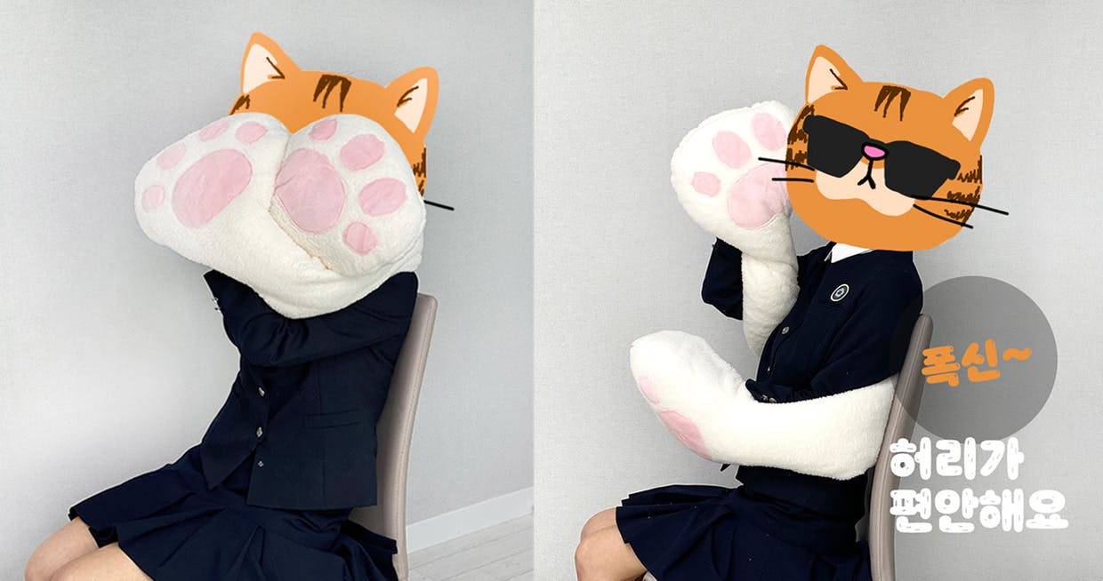 쿠션의 고양이 손 부분에 장갑처럼 사람 손을 넣어 몸에 두를 수 있습니다.