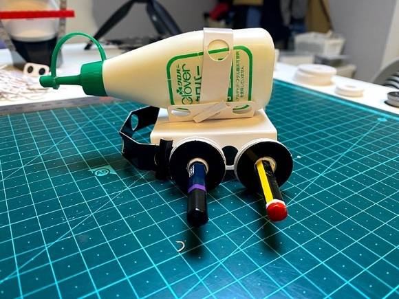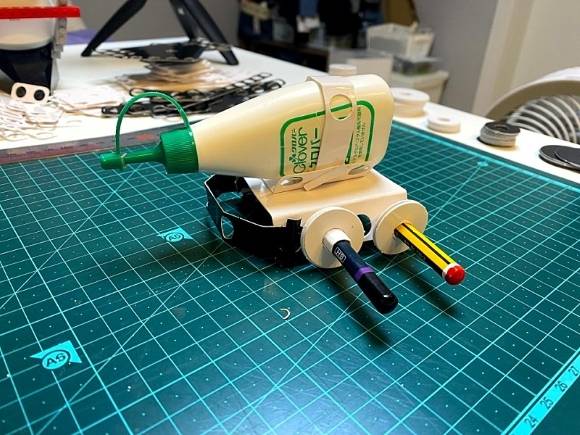 이렇게 꼽으면 연필의 육각 부분이 바퀴의 O 부분에 딱 맞게 고정할 수 있습니다. 그리고 바퀴는 몇개를 넣어주면 됩니다. 조금 더 안정되게 하려면 풀을 붙이면 됩니다.