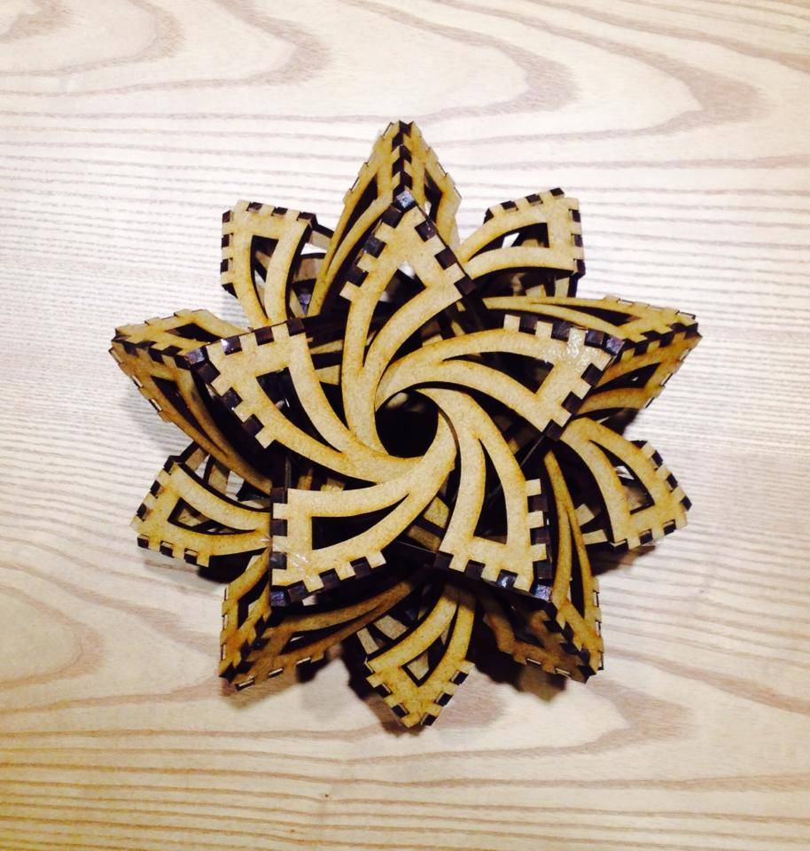Frabjous라는 이름의 퍼즐인데요, 레이저 컷팅기로 MDF를 잘라 가조립 한 상태에요~ 12면체를 기반으로 안쪽으로 꼭지점 끼리 이어진 형태입니다!! 빛이 통과할 수 있는 아크릴로 만들면 아주 아름다운 조명이 될 것 같아요~ 아크릴 버전도 기대해 주세요 :D !!