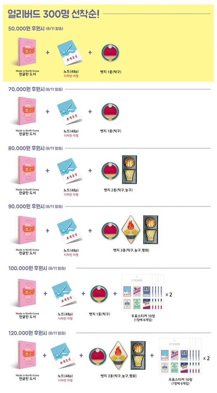 100,000원 이상 밀어주시는 분께 (8월11일 발송) 책속에 소개된 남북단일팀 탁구배지 레프리카(1) Made in North Korea 한글판도서 Made in North Korea 오리지널 노트(1) 북한우표 10장 1세트 오리지널 스티커(1)