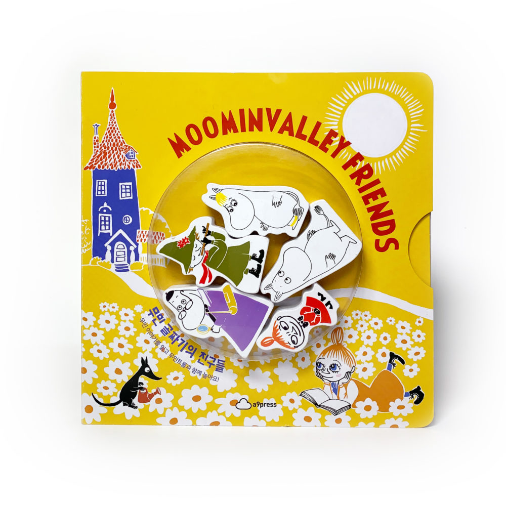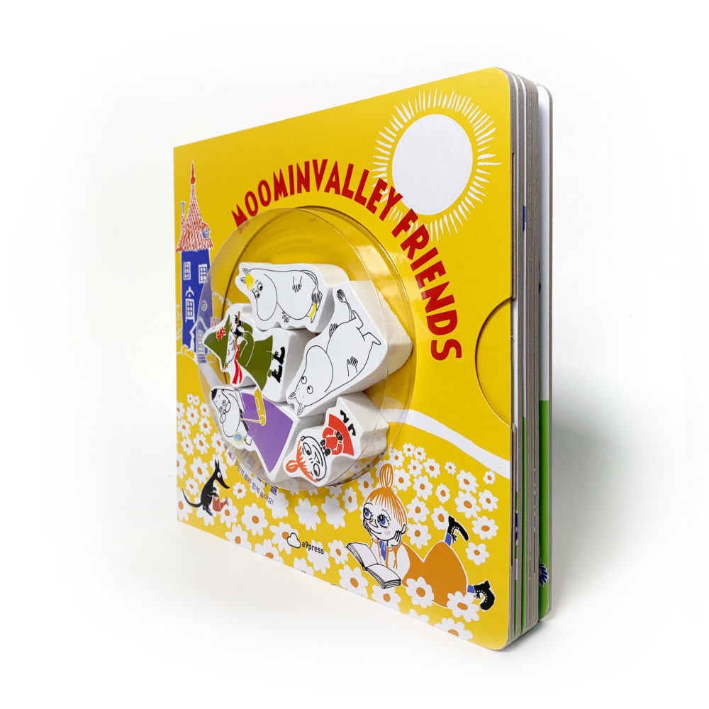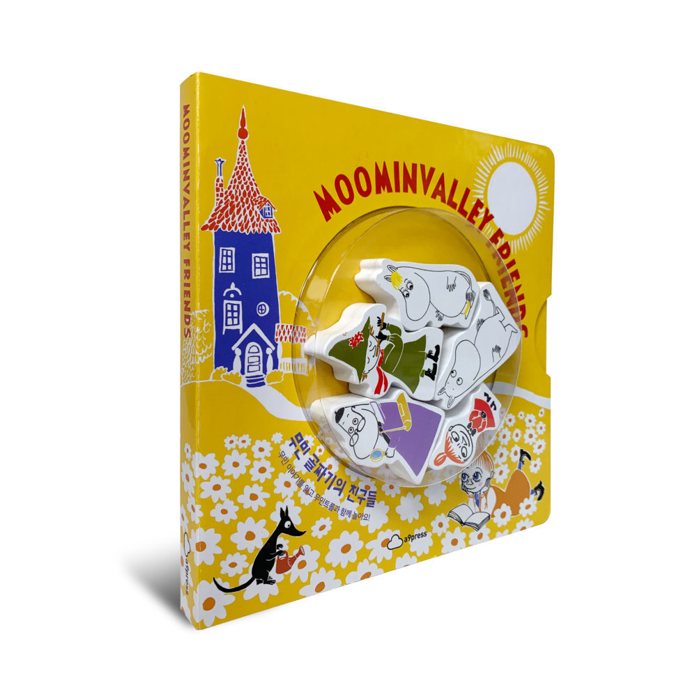– 무민트롤, 스노크메이든, 헤뮬렌, 리틀미이, 스너프킨 등 대표 캐릭터 등장이 책의 가장 큰 특징은 나무로 만든 캐릭터 피규어가 있다는 점입니다. 어린이들이 손에 들고 놀기에 적합한 크기로 만들었습니다. 또한 책장을 열면 캐릭터마다 캐릭터 모양의 피규어가 꼭 맞도록 홈이 파여 있어, 이 홈에 피규어를 넣음으로 손놀이를 체험할 수 있도록 구성하였습니다. 무엇보다 양면으로 구성된 피규어의 방향을 잘 맞추어야 홈에 딱 맞기 때문에 방향감과 순발력을 얻을 수도 있습니다.