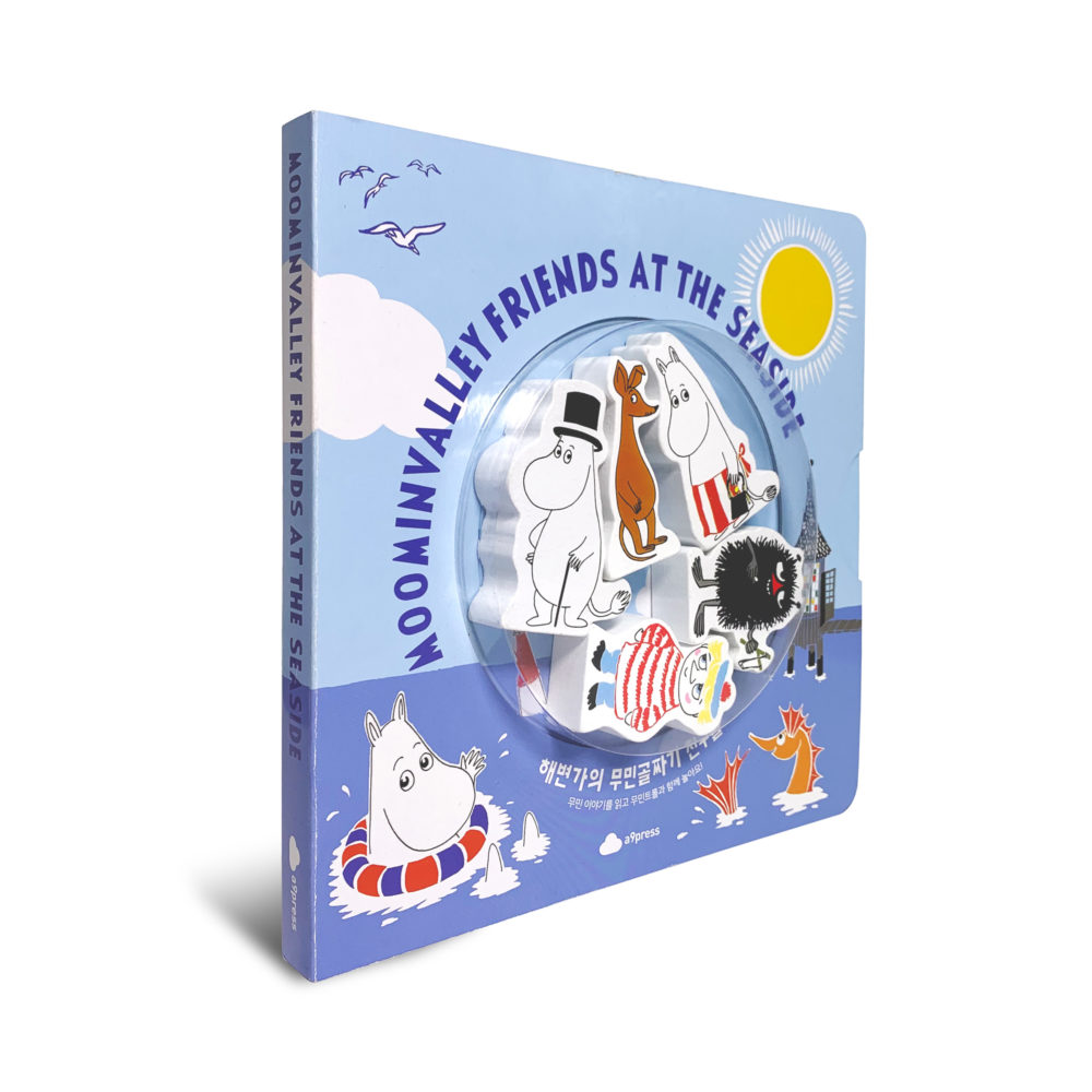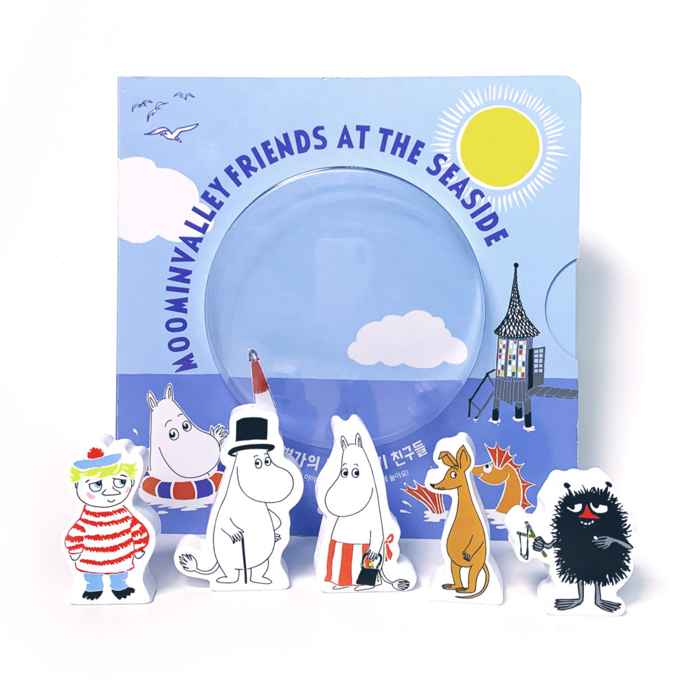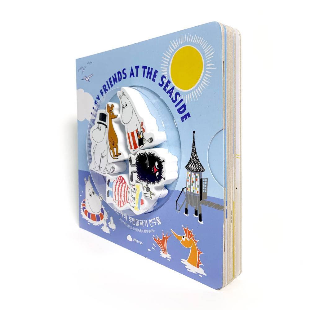 – 무민트롤, 스노크메이든, 헤뮬렌, 리틀미이, 스너프킨 등 대표 캐릭터 등장이 책의 가장 큰 특징은 나무로 만든 캐릭터 피규어가 있다는 점입니다. 어린이들이 손에 들고 놀기에 적합한 크기로 만들었습니다. 또한 책장을 열면 캐릭터마다 캐릭터 모양의 피규어가 꼭 맞도록 홈이 파여 있어, 이 홈에 피규어를 넣음으로 손놀이를 체험할 수 있도록 구성하였습니다. 무엇보다 양면으로 구성된 피규어의 방향을 잘 맞추어야 홈에 딱 맞기 때문에 방향감과 순발력을 얻을 수도 있습니다.