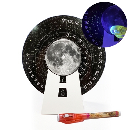 2개의 휠로 일, 월 판을 회전하여 365일을 모두 표현하는 만년력으로 밤에는 조명이 없을 때 함께 동봉된 비밀 펜 조명을 켜면 조선의 별자리가 나타나는 것을 보실 수 있어요. 우리의 별자리는 어떻게 하면 달랐을까요? QR코드를 활용하여 조선 시대 별자리에 대한 이야기를 찾아보세요.