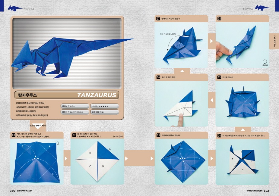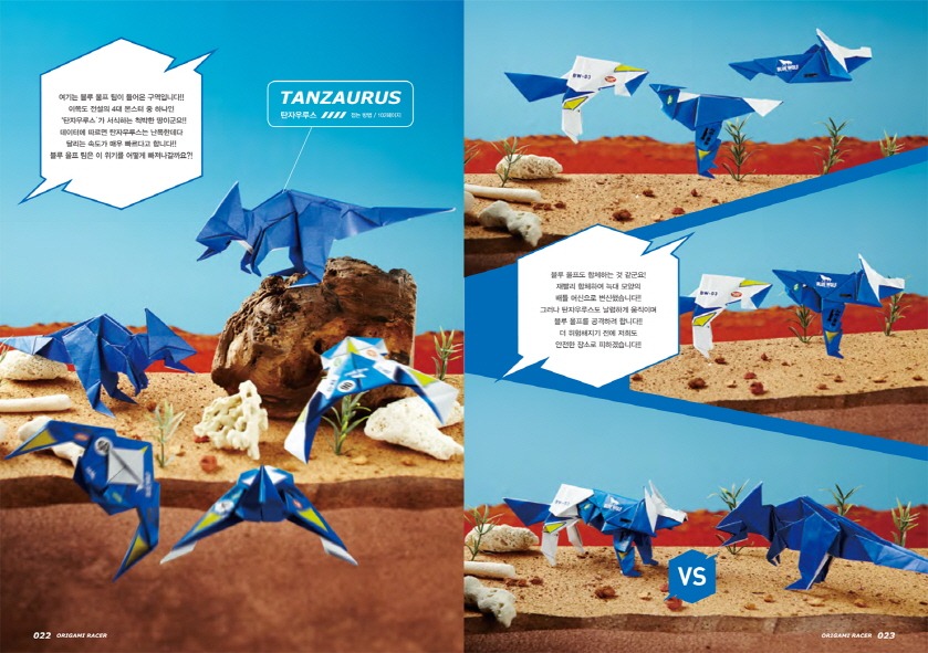 레드 팔콘 RF-01 / 레드 팔콘 RF-02 / 레드 팔콘 RF-03 / 레드 팔콘을 합체시키자! / 블루 울프 BW-01 / 블루 울프 BW-02 / 블루 울프 BW-03 / 블루 울프를 합체시키자! / 그린 스코피온 GS-01 / 그린 스코피온 GS-02 / 그린 스코피온 GS-03 / 그린 스코피온을 합체시키자! / 종이접기 레이서 게임 1 / 옐로 샤크 YS-01 / 옐로 샤크 YS-02 / 옐로 샤크 YS-03 / 옐로 샤크를 합체시키자! / 종이접기 레이서 게임 2 / 앰버키우스 / 페리토돈 / 데만톱스 / 가드라곤 / 가드라곤의 날개를 움직여보자! / 탄자우루스 / 라스피사우루스 / 카루사우루스 / 종이접기 레이서의 수수께끼 / 토파토퍼스 / 종이접기 레이서 게임 3 / 종이접기 레이서 게임 4