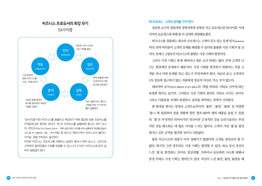 똑같은 문제라도 상위 1%에 해당하는 비즈니스 프로듀서들이 선택하는 솔루션은 다르다. 때로는 비상식적으로 보이기도 하고, 터무니없다고 생각되기도 하지만 결국에는 대단한 성과로 이어진다. 과연 우리와 무엇이 다를까? 그들의 머릿속에는 무엇이 들어 있을까? 저자는 성공한 사람들의 사례를 면밀히 분석한 결과, 거기에 공통점이 있음을 발견했다. 바로 그들이 몇 가지 프로세스를 반복적으로 실천하고 있다는 것이었다. 그는 이를 5사이클이라고 이름 붙였다. 고객이 안고 있는 문제에 대한 ‘인지(Awareness)’, 문제 해결을 위한 지금까지와 다른 ‘접근(Approach)’, 아이디어의 신속한 ‘실행(Action)’, 가설과 실행 결과의 차이에 대한 ‘분석(Analysis)’, 시장의 니즈에 맞춘 유연한 ‘적응(Adjustment)’이 바로 그 다섯 가지 프레임워크이다. 5A사이클을 지속적으로 순환시키면 빠르게 바뀌는 시장의 흐름에 효과적으로 대응할 수 있고, 보다 높은 고객 가치를 창출할 수 있다고 한다.