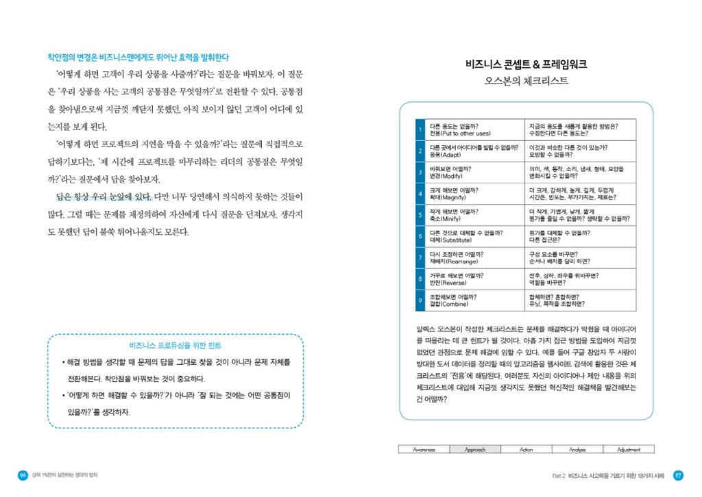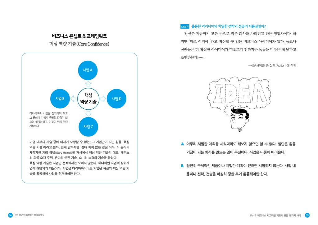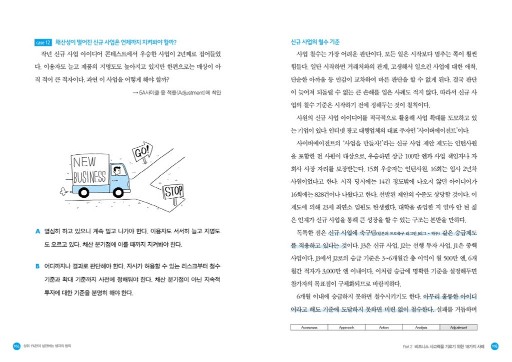 두 번째 파트부터는 본격적으로 실제 기업의 사례를 통해 5A사이클을 훈련해본다. 보다 흥미를 느낄 수 있도록 퀴즈 형식으로 구성했다. 실화를 각색한 문제와 선택지가 실려 있어 독자들은 ‘나라면 어떻게 했을까’ 고민해볼 수 있다. 그 뒤에는 실제로 기업에서 어떤 일이 있었으며 문제를 성공적으로 해결한 솔루션은 무엇이었는지 해설해준다. 시장 변화에 적극적으로 대처해 사업 방향 전환에 성공한 후지필름의 사례, 고객 만족을 최우선으로 한 고품격 서비스로 세계적인 명성을 얻은 리츠칼튼의 사례에서 혁신적인 정보 분류 방법으로 최고의 웹기반 검색 비즈니스를 재패한 구글의 사례까지. 성공 가도를 달리고 있는 유명 기업의 일화를 바탕으로 비즈니스에서 이노베이션을 일으킬 수 있는 생각의 법칙을 제시한다. 또, 각 사례의 마지막 장에는 ‘비즈니스 콘셉트&프레임워크’라는 컬럼을 실어 이해를 돕도록 했다. ‘피져빌리티 스터디’, ‘파토레법칙과 롱테일’, ‘코틀러의 경쟁지위 분류’ 등 5A사이클을 실천하는 데 필요한 용어나 개념을 살펴볼 수 있다.