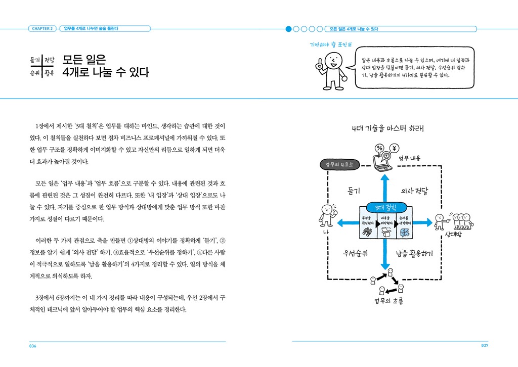 수많은 업무들을 나누기 좋은 단위로 세분화하고, 그 이후엔 필요한 일에 주력하여 실행한다는 얘기다. 예를 들면 상대의 의견을 물을 때 ‘듣기’를 의식하고, 일정을 조정할 때는 ‘우선순위’에 집중하는 식이다.