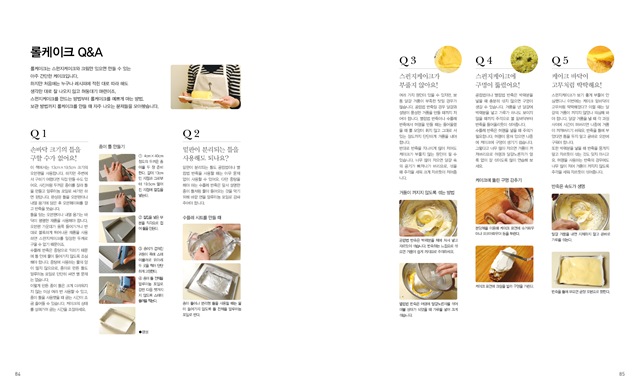 손바닥 크기의 틀을 구할 수가 없어요! / 밑판이 분리되는 틀을 사용해도 되나요? / 스펀지케이크가 부풀지 않아요! / 스펀지케이크에 구멍이 뚫렸어요! / 케이크 바닥이 고무처럼 딱딱해요! / 케이크에 덜 익은 부분이 있어요! / 시간이 지나면 케이크가 줄어들어요! / 시트에서 종이가 깨끗하게 벗겨지지 않아요! / 케이크를 말 때 내용물이 삐져나와요! / 둥글게 말려고 하면 케이크가 자꾸 갈라져요! / 장식이 예쁘게 되지 않아요! / 케이크는 얼마나 보관할 수 있나요?