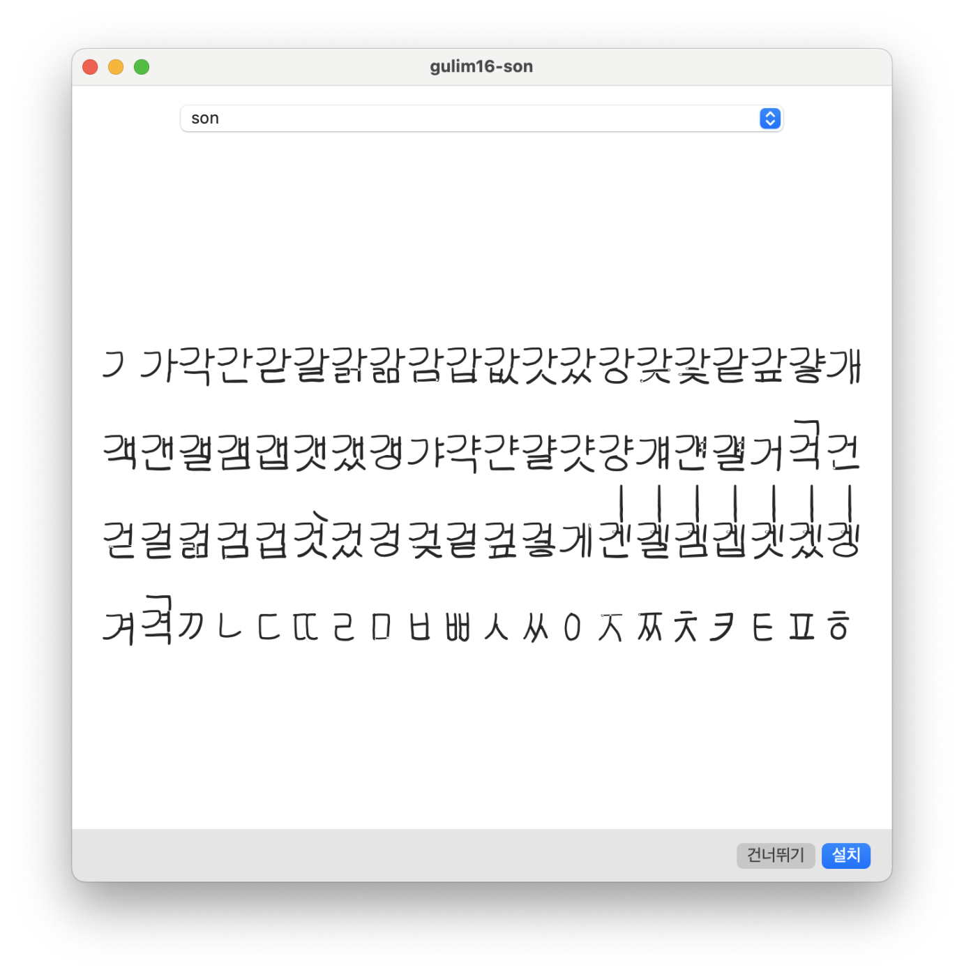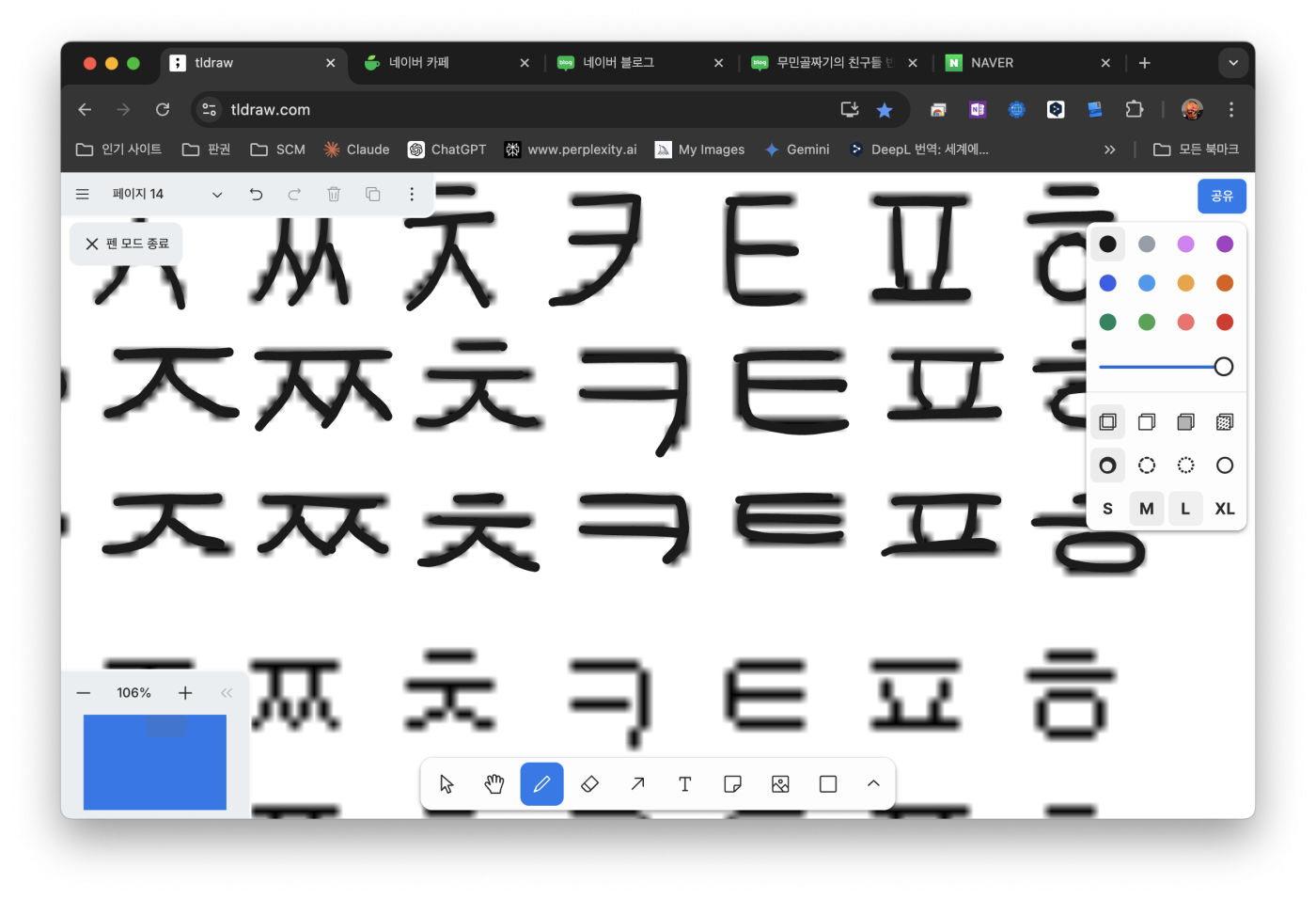 밑그림의 글자 위에 손글씨 느낌이 나게 tldraw로 초성, 중성, 종성 모양대로 그려줍니다. 같은 ㅎ 자도 어디에 위치하느냐에 따라 모양이 모두 다른 것을 감안해서 그려줘야 하며 256자 기준으로 작업하면 되는데 눈이 침침해서...