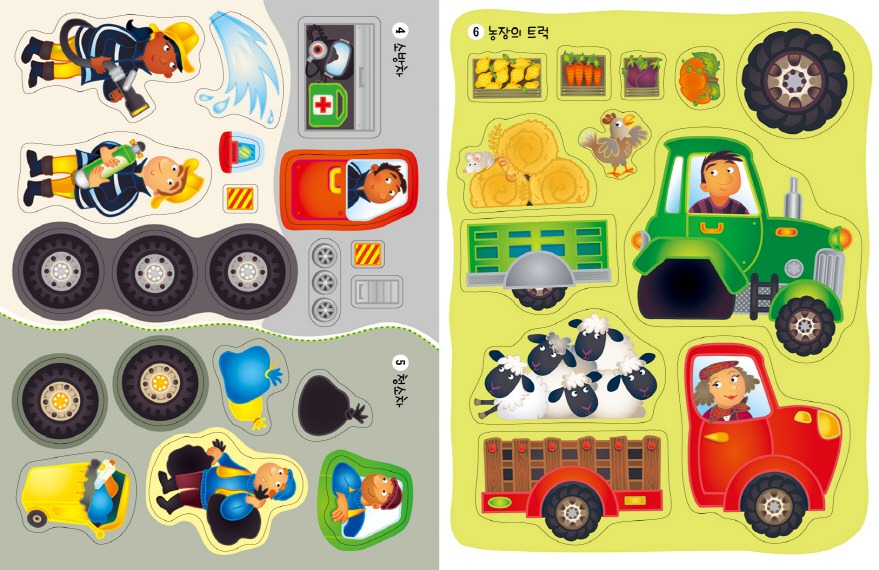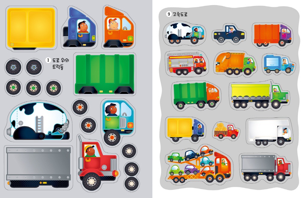 <뛰뛰빵빵 트럭 만들기>에는 트럭을 완성할 수 있는 갖가지 바퀴와 트레일러, 운전사 등 소품 스티커가 100매 이상 수록되어 지루할 틈이 없습니다.