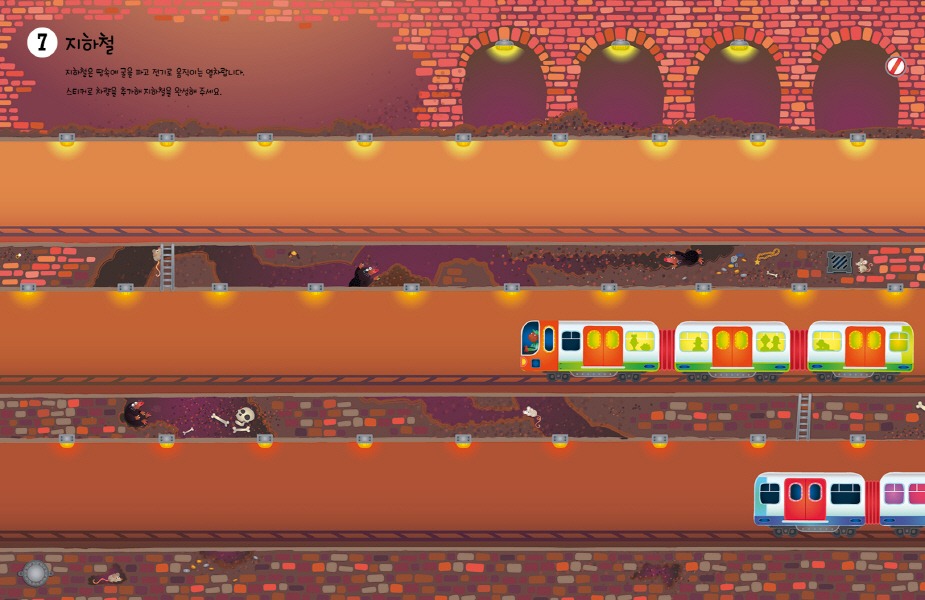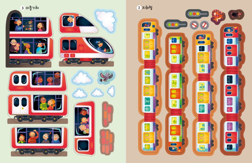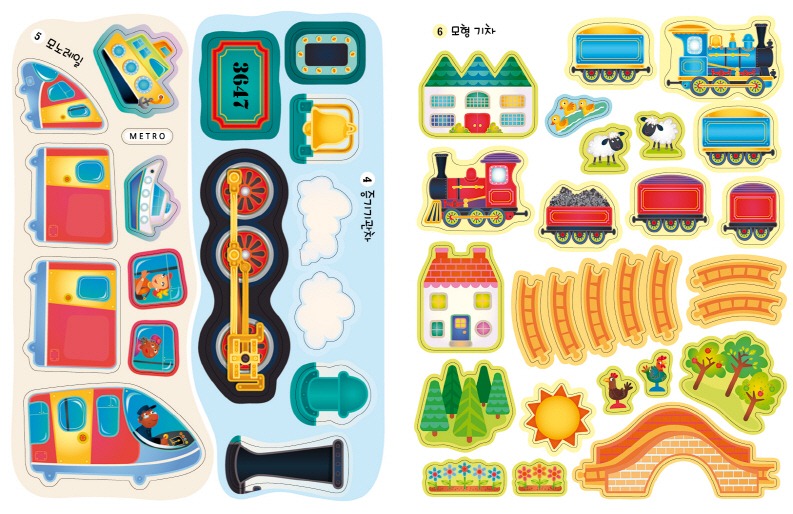 승객으로 붐비는 기차역을 비롯해 초고속열차, 지하철, 증기기관차, 모노레일, 이층기차, 산악열차 등 세계의 기차들은 모두 만나볼 수 있습니다. 알맞은 위치에 컨테이너를 올리고 바퀴와 차량을 스티커로 붙이다 보면 인지력과 집중력도 쑥쑥 자라납니다.