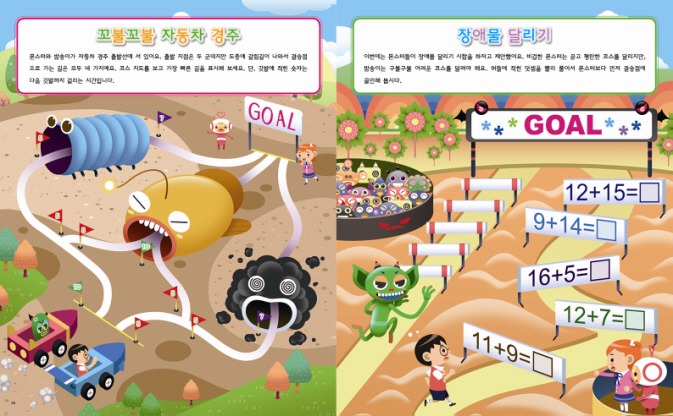 <수학대탈출①>에는 수학을 싫어하는 밤송이가 친구 예린이와 함께 수학나라에 갇히게 되면서 이야기가 시작됩니다. 숫자 몬스터들이 내는 여러 가지 문제들을 풀면서 수학나라를 탈출해야만 하죠. 주인공들의 흥미진진한 이야기에 빠져들어 문제를 풀면 지루할 틈이 없습니다. 단순히 공식이나 수학식을 나열하는 것이 아니라 퍼즐과 미로로 구성되어 있기 때문에 거부감 없이 수학을 접할 수 있습니다. 특히 미로는 집중력을 키우기에도 좋답니다. 아기자기하고 귀여운 그림체는 아이들의 눈을 사로잡기에 충분하죠.