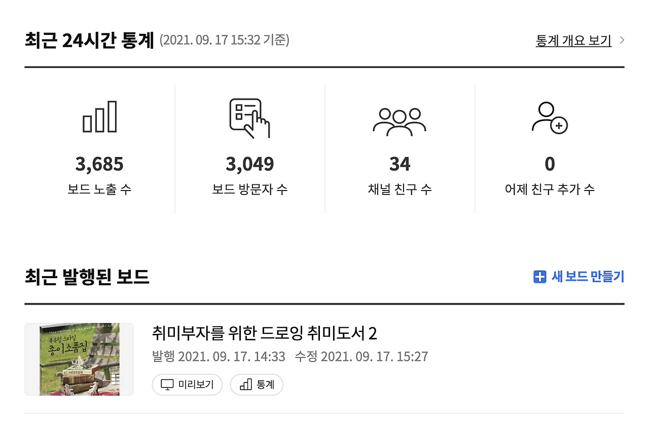 보드는 더 노출이 되고 보드 방문자 수도 그만큼 늘어납니다. 채널 친구 수는 별로 중요하지 않습니다. 일단 보드에 소개된 글들이 더 많이 노출되어야 브랜드를 유지할 수 있고 재미있으면 친구가 늘어나겠죠.