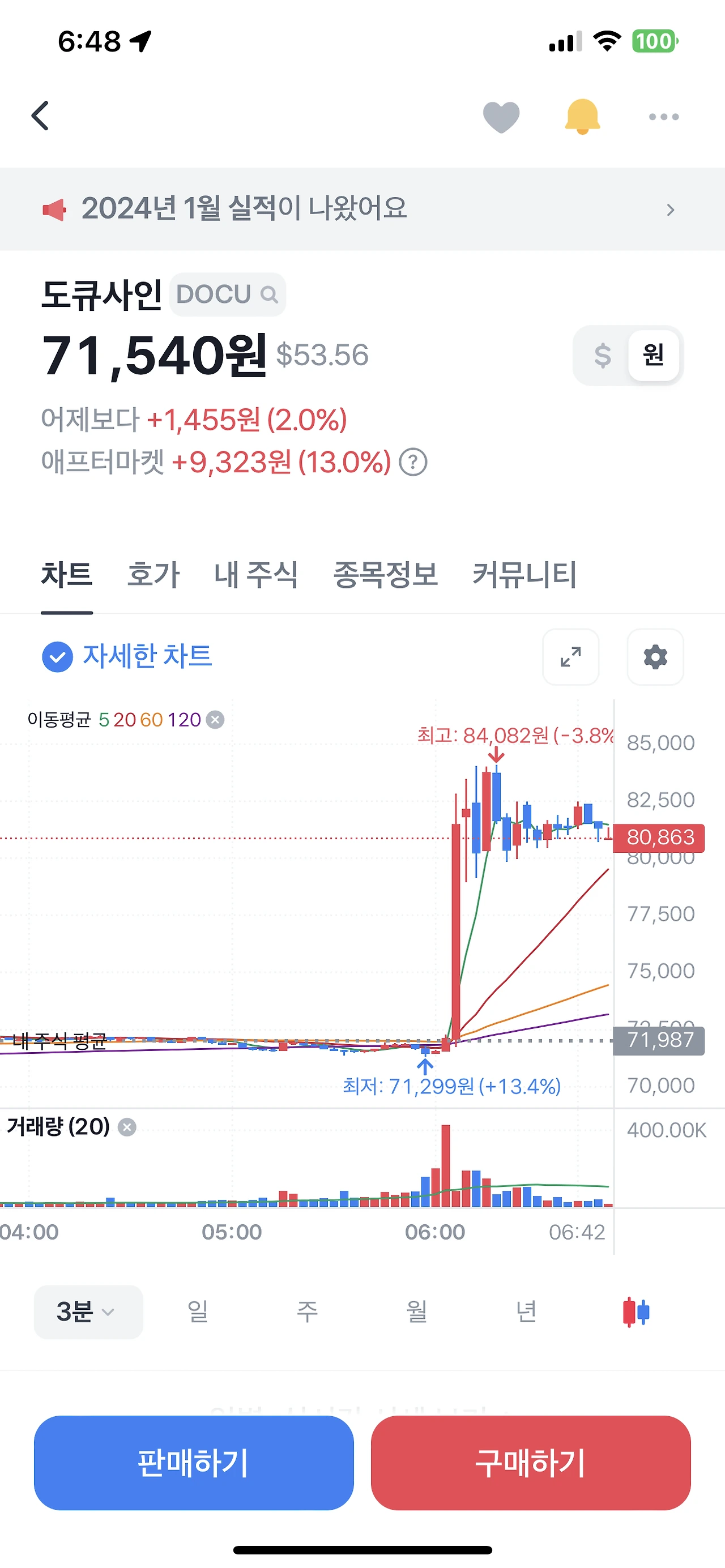 미인대회 주식을 안따르고 피터린치의 투자방법인 아내가 쓰는 제품을 사라! 실생활에 겹쳐지는 도큐사인을 구매했습니다. 장마감후 너무 졸려서 잠깐 잤는데 구매가 보다 약간 떨어졌고 애프터마켓에서 16.8%->13.0% 정도 올랐습니다. 데일리장 -> 본장까지 잘 하면 18% 왔다갔다 할거 같습니다.