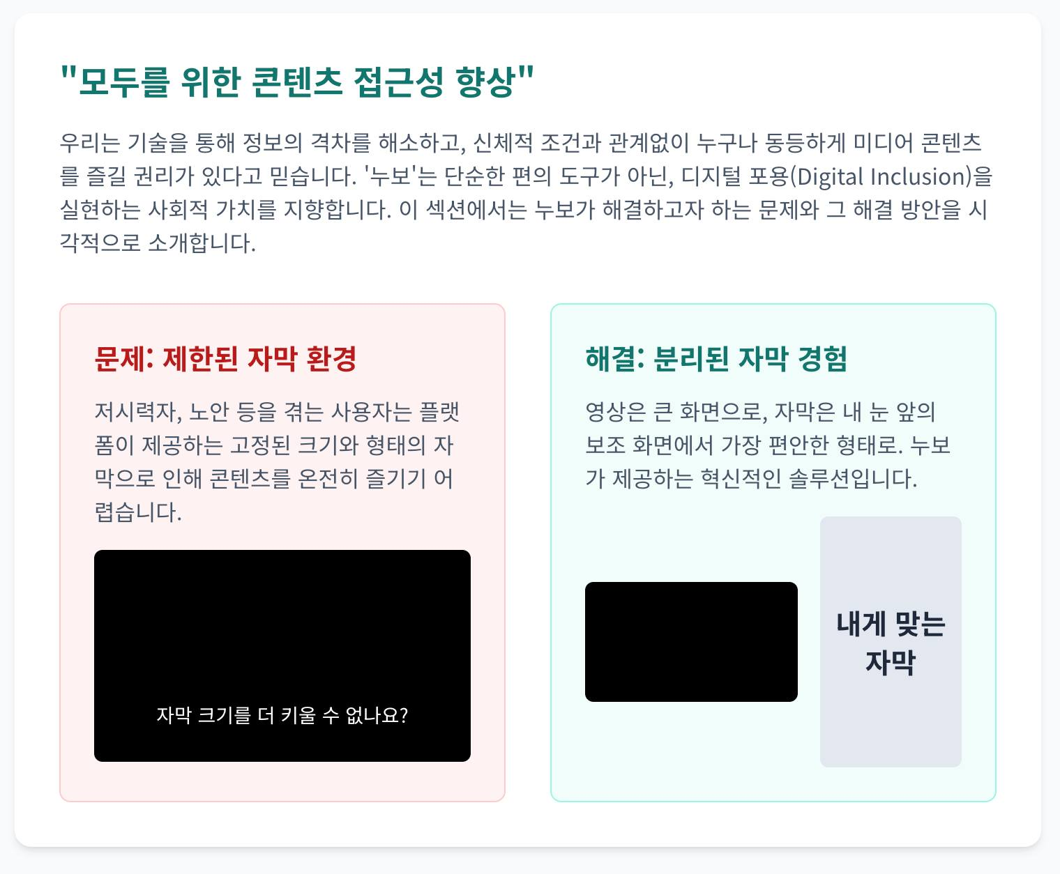신체적 조건과 관계 없이, 누구나 동등하게 미디어 콘텐츠를 즐길 수 있도록. 누보가 새로운 차원의 콘텐츠 접근성을 제안합니다.