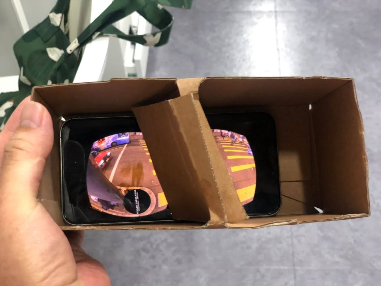 별다른 문제 없이 다른 고정장치 없이 VR을 볼 수 있으며 손을 넣을 수 있기 때문에 인터페이스 조작도 가능합니다. 아래 손가락 하나 들어가는 구멍을 만들면 될거 같습니다. (옛날에 박스로 만든게 부품으로 자석도 아까워 손가락을 넣게 했습니다. )