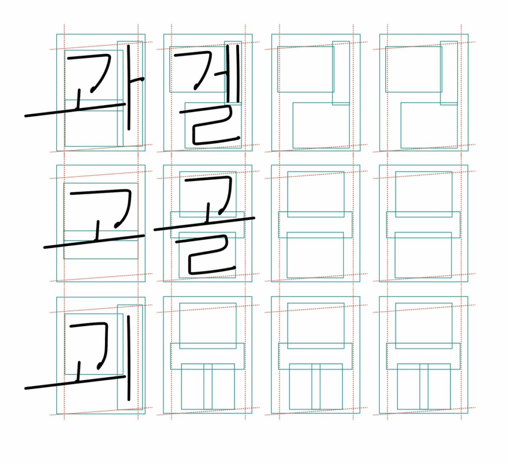 초, 중, 종성의 컴포넌트의 위치값을 이용해서 너비 높이를 조절해서 두깨나 모양을 유지하면서 배치할 수 있게 만드는 것을 할 수 있기 때문입니다. 일정 유형을 학습해서 하나의 폰트가 수 많은 특성을 가진 폰트의 유형으로 뽑아낼 수 있습니다.