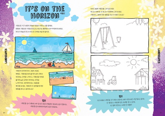 미술의 기본이라 할 수 있는 풍경 그리기도 배울 수 있어요. 풍경 그리기의 중요한 요소들을 알아보고 다양한 경치 그리기 기법에 대해서도 단계별로 자세히 설명되어 있어요.