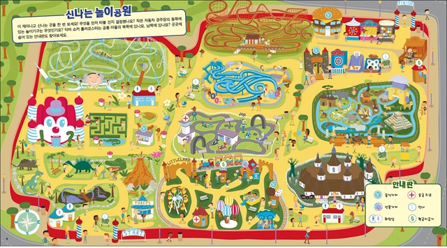 <요리조리 놀이공원 대탐험>은 취학 전 아이에게 맞춰 미로를 단순화하고 길만 크게 만든 책이 아닙니다. 이 책은 크게 놀이공원과 동물원으로 테마를 나누어 미로와 함께 방향 감각을 키울 수 있는, 동서남북 문제를 배치했습니다. 모든 공간에서 아이는 사람 혹은 동물, 물건이 동서남북, 어느 방향에 있는지를 풀어야 합니다. 이 퀴즈는 나침반과 안내판을 잘 활용하는 것은 물론 집중력을 가지고 페이지 전체를 살펴야만 답을 구할 수 있습니다.