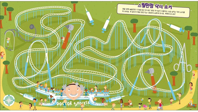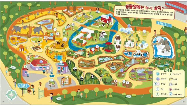 이 책은 펜이 아닌 손가락을 이용해 길을 찾도록 구성되었습니다. 손가락으로 종이의 질감을 느끼며 이곳저곳을 기웃거리다 도착점을 찾는 식이죠. 미로는 손가락 크기에 맞춰 알맞은 크기로 디자인 되었고 가는 길목마다 테마에 맞는 캐릭터를 배치해 즐거움을 더했습니다.