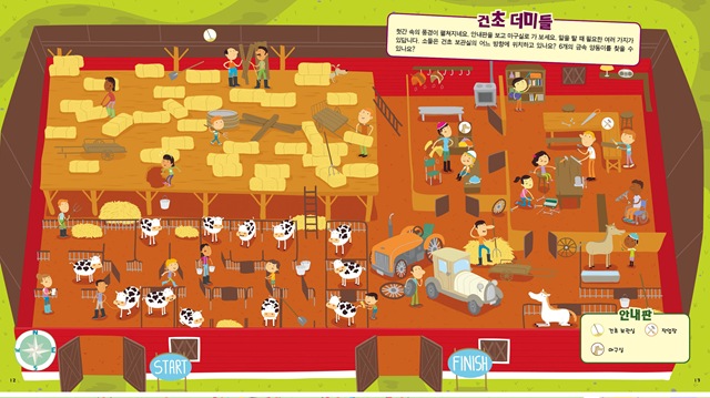 <요리조리 농장 대탐험>은 취학 전 아이에게 맞춰 미로를 단순화하고 길만 크게 만든 책이 아닙니다. 이 책은 크게 농장과 동물원으로 테마를 나누어 미로와 함께 방향 감각을 키울 수 있는, 동서남북 문제를 배치했습니다. 모든 공간에서 아이는 사람 혹은 동물, 물건이 동서남북, 어느 방향에 있는지를 풀어야 합니다. 이 퀴즈는 나침반과 안내판을 잘 활용하는 것은 물론 집중력을 가지고 페이지 전체를 살펴야만 답을 구할 수 있습니다.