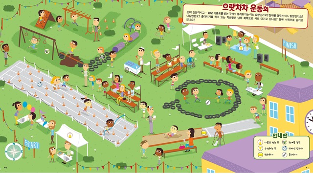 이 책은 펜이 아닌 손가락을 이용해 길을 찾도록 구성되었습니다. 손가락으로 종이의 질감을 느끼며 이곳저곳을 기웃거리다 도착점을 찾는 식이죠. 미로는 손가락 크기에 맞춰 알맞은 크기로 디자인 되었고 가는 길목마다 테마에 맞는 캐릭터를 배치해 즐거움을 더했습니다.